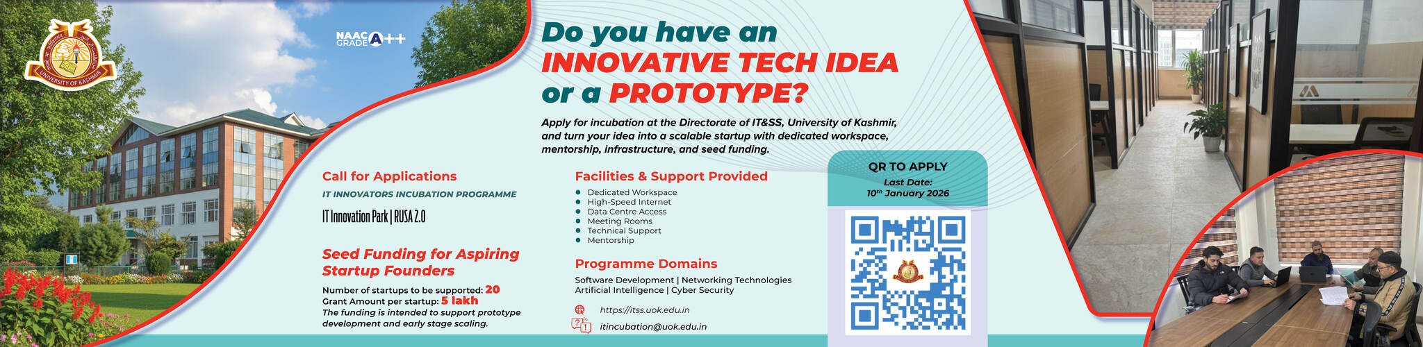 The Directorate of Information Technology & Support System (IT&SS), University of Kashmir, invites applications for incubation under the IT Innovators Incubation Programme, established as part of the Cloud IT Innovation Park under RUSA 2.0.